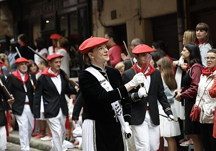 La compañía integrada por hombres y mujeres desfiló con normalidad por la calle Mayor, entre gritos de ánimo y aplausos de sus seguidores. En el pórtico de la iglesia parroquial les esperaba la representación institucional, con el alcalde, la vicelehendakari, Ibone Bengoetxea; la diputada general, Eider Mendoza, y concejales de Abotsanitz, EAJ-PNV, EH Bildu y PSE. En este punto, Nora Ferreira le entregó a Igor Enparan una carta en la que reclamaba «pasos adelante» y que «no siga poniendo al mismo nivel a las dos partes: nosotras estamos en una lucha por los derechos de la mujer a participar en igualdad, y la otra parte tiene como único fin impedir que la mujer participe».