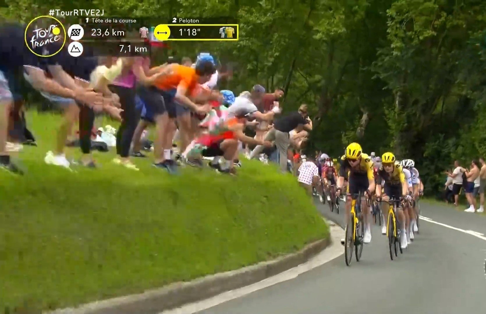 Un pasillo muy estrecho de aficionados empujaban al amplio número de ciclistas que a falta de 3 kilómetros para alcanzar la cima ha conseguido superar al ciclista estadounidense, escapado desde los primeros compases de la etapa y que ha terminado por descolgarse. Adam Yates, con su reciente maillot amarillo, seguido de Pogacar, además de un pelotón de más de 40 corredores, han coronado el alto sobre a las cinco en punto de la tarde.