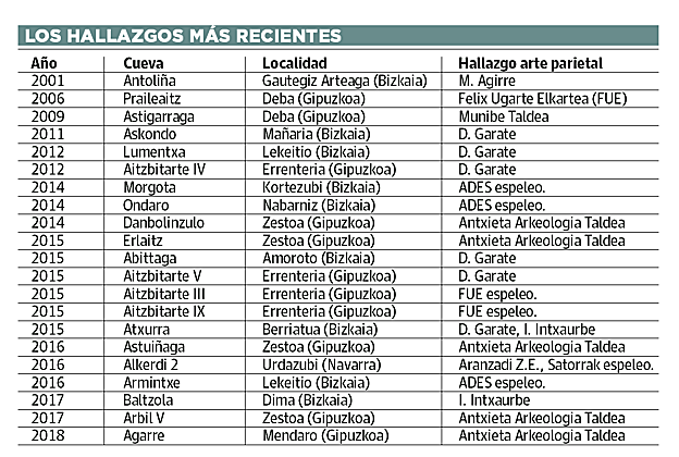 Tal como puede verse en la tabla que recoge los hallazgos de cuevas con arte rupestre -la atribución del hallazgo se refiere a ese aspecto, no al descubrimiento de la cavidad- realizados en lo que llevamos de siglo en la CAV y Navarra, Garate y los equipos con los que ha trabajado han contribuido de manera destacada a llenar el llamado 'vacío vasco'. Dicho de otra manera, a desmentir la llamativa falta de cuevas con arte parietal paleolítico en un territorio lindante con dos zonas -la que integran Cantabria y Asturias, y el suroeste francés- donde ese tipo de vestigios eran muy abundantes.