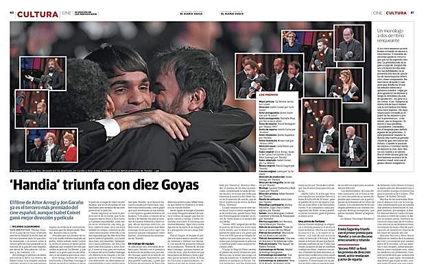 Hace dos años, 'Handia', dirigida por Jon Garaño y Aitor Arregi, fue preseleccionada junto a 'Campeones' y 'Todos lo saben' para representar a España en Óscar. La muy taquillera película de Javier Fesser se impuso a la película guipuzcoana que, sin embargo, dio el campanazo en los Goya. El cine vasco nunca olvidará aquella noche del 3 de febrero de 2018, cuando 'Handia' hizo historia al lograr diez de los trece Goyas a los que estaba nominada. Una cifra récord (la tercera producción con más premios de la historia de estos galardones tras los 14 de 'Mar adentro' y los 13 de 'Ay, Carmela') solamente ensombrecida por no haber logrado los de mejor dirección y mejor película, que se llevó Isabel Coixet con 'La librería'.