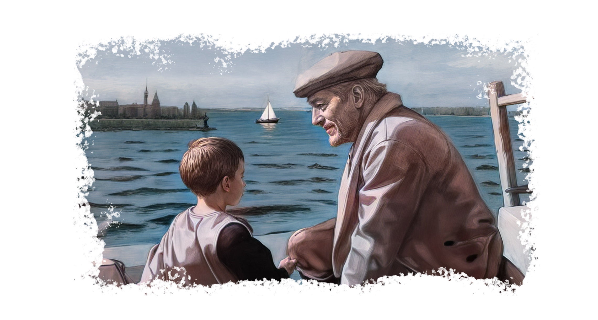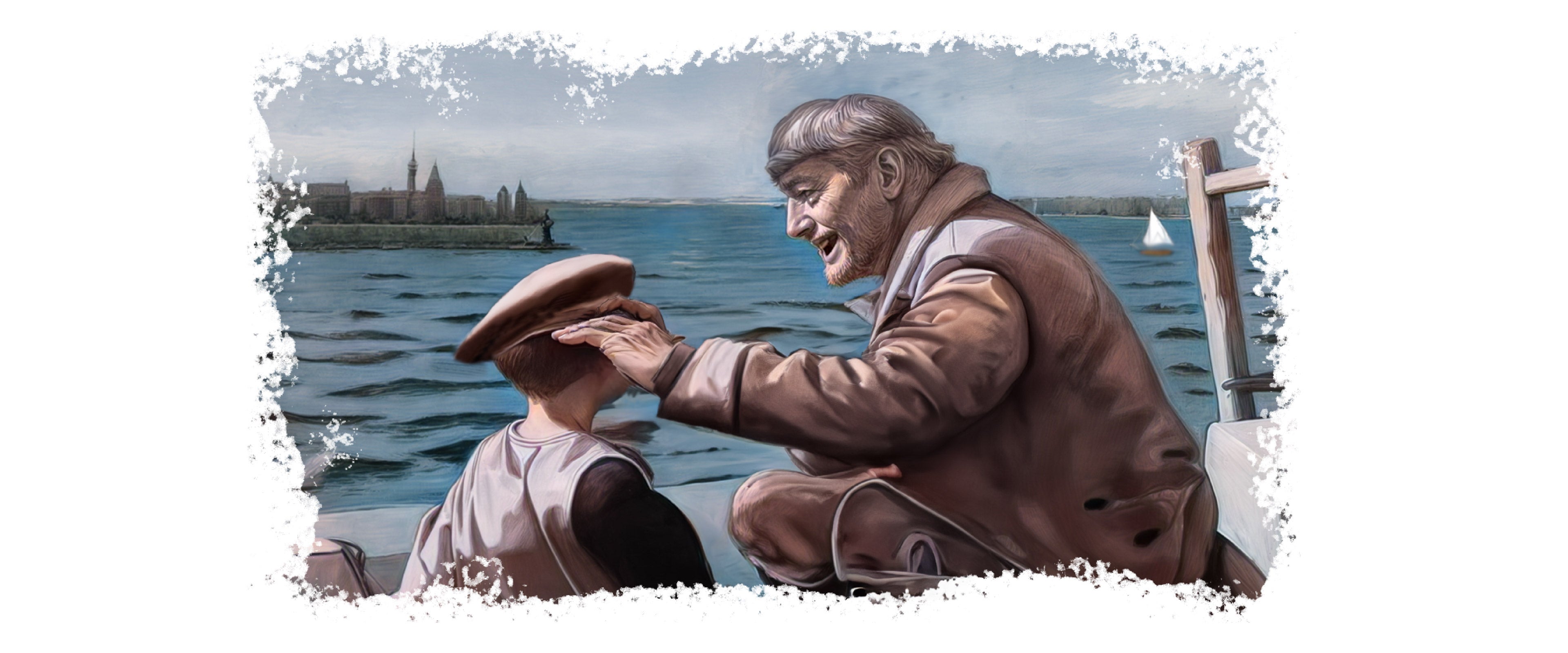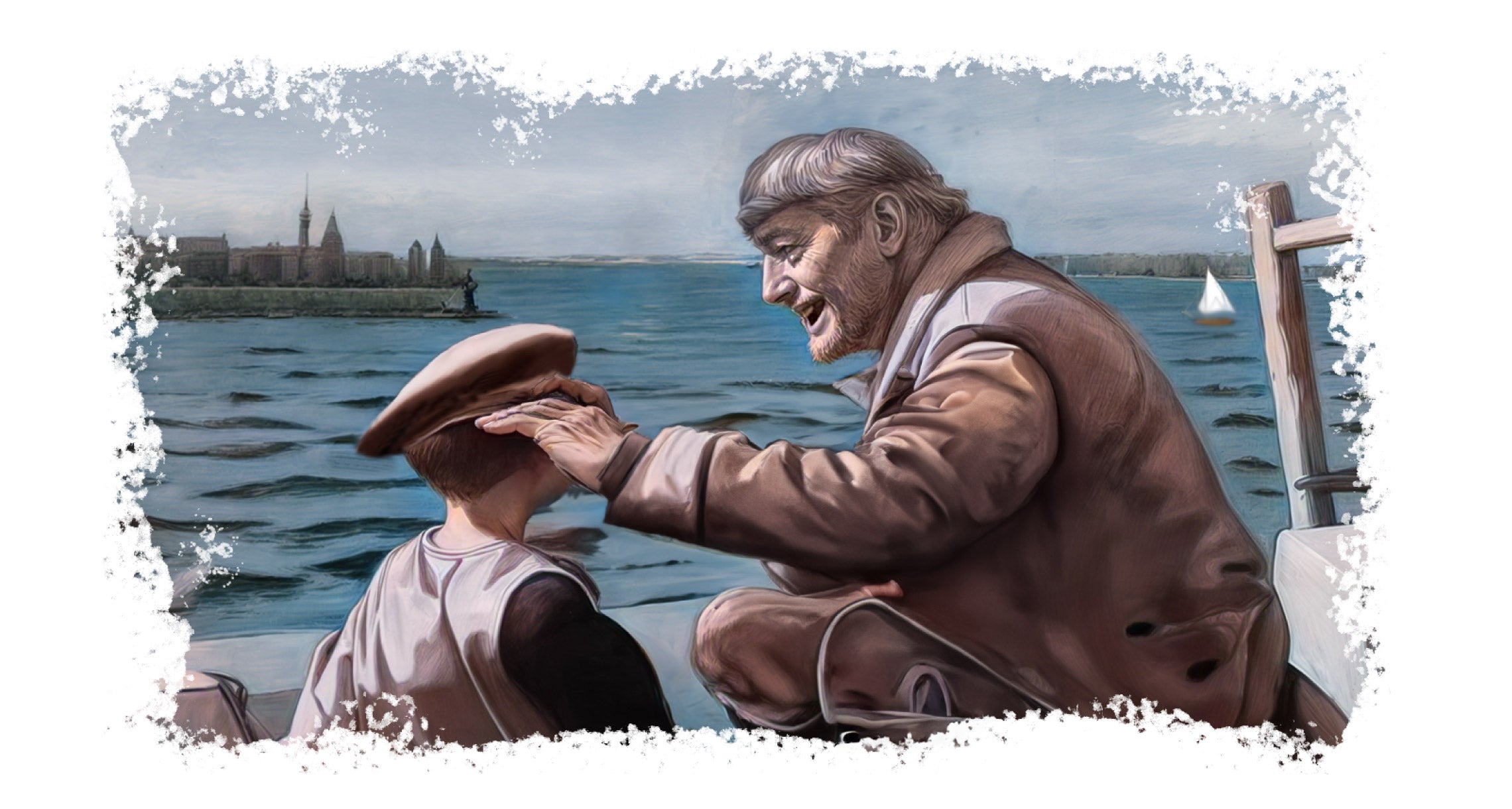 Venga, ayúdame con los remos y vamos a achicar el bote. Algún día será tuyo y tienes que aprender a cuidarlo, a quererlo. Sí, ya sé que quieres ir al parque a jugar al fútbol... Vamos, ven, que tengo una sorpresa para ti. Toma, ponte mi txapela, si terminamos pronto te llevo al Itsas Festibala de Pasaia. Verás los barcos que has imaginado con tus propios ojos.