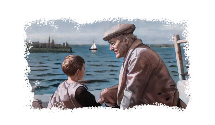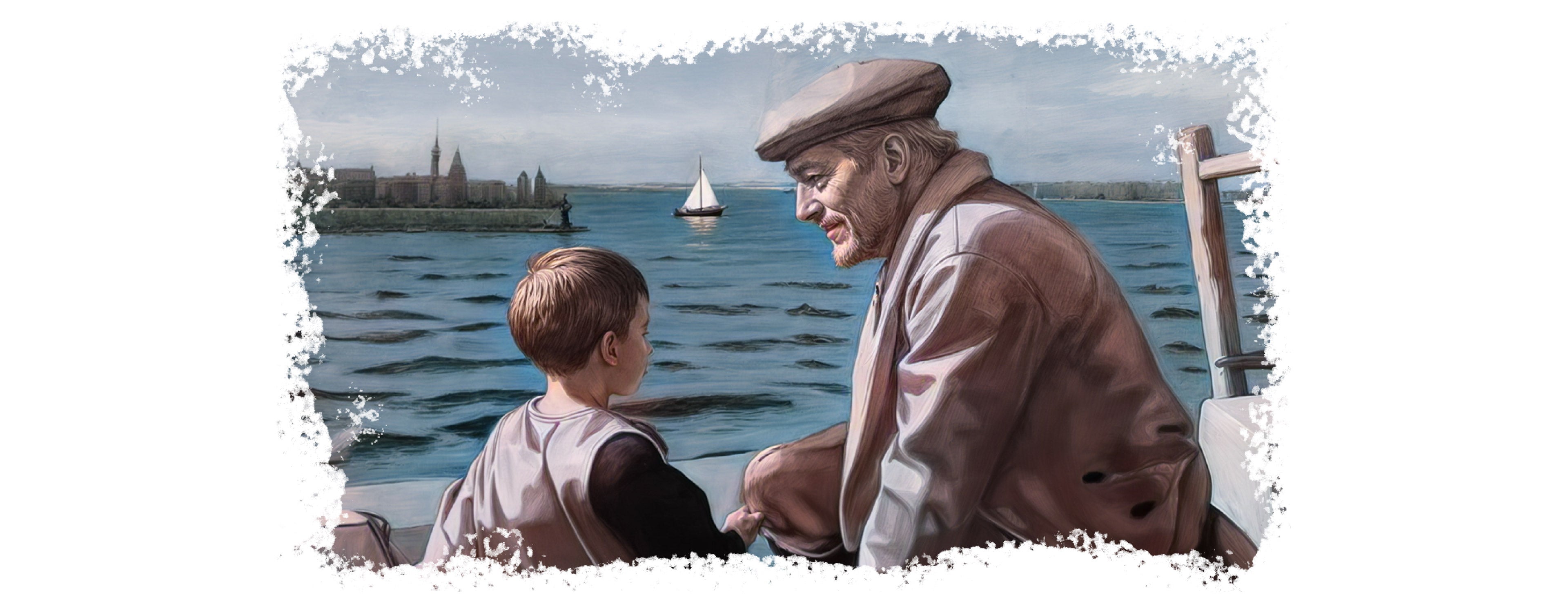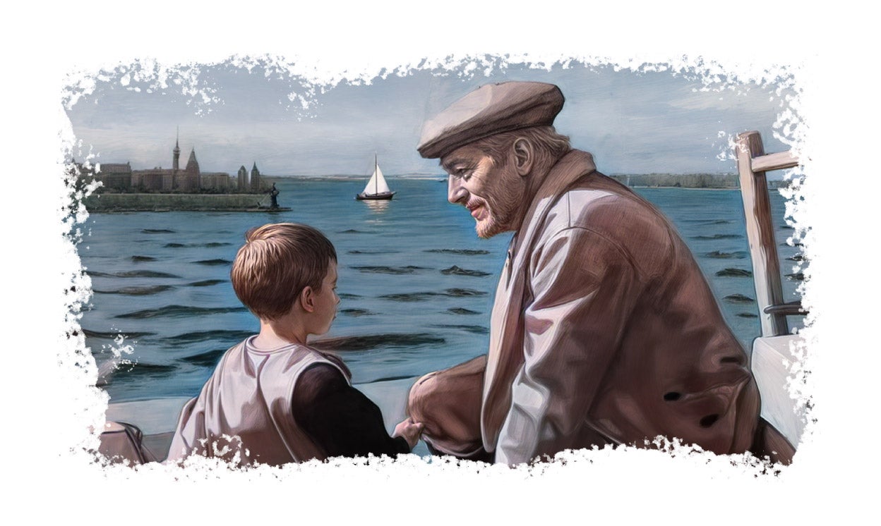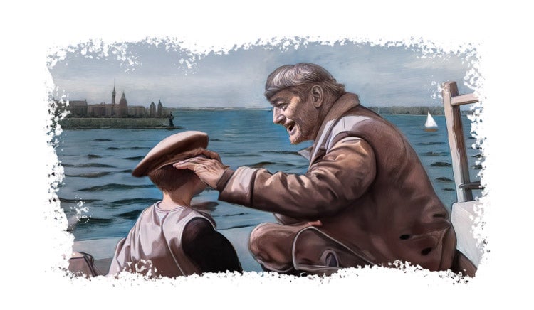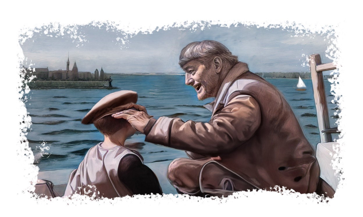Venga, ayúdame con los remos y vamos a achicar el bote. Algún día será tuyo y tienes que aprender a cuidarlo, a quererlo. Sí, ya sé que quieres ir al parque a jugar al fútbol... Vamos, ven, que tengo una sorpresa para ti. Toma, ponte mi txapela, si terminamos pronto te llevo al Itsas Festibala de Pasaia. Verás los barcos que has imaginado con tus propios ojos.