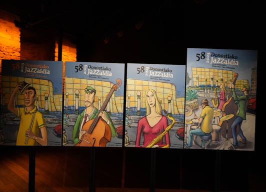 De ahí la bailarina original pasó a convertirse en saxofonista de un trío de jazz que actúa a la entrada del Victoria Eugenia. «Tenía que representar a la protagonista, la ciudad, con esa nocturnidad que me evoca la música de jazz». El cartel está acompañado por otras tres ilustraciones de cada uno de los tres personajes del cuadro que decorarán las banderolas durante el Jazzaldia. 58 copias de los carteles están disponibles para su compra en formato NFT.