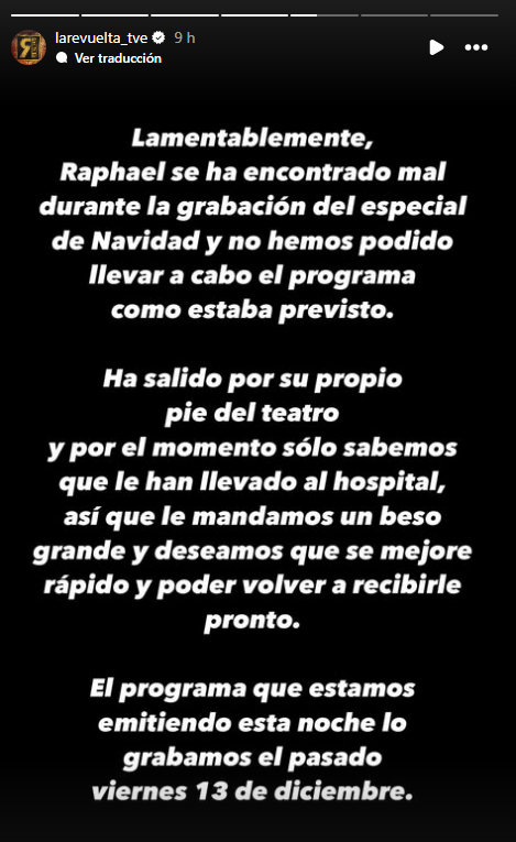«Lamentablemente, Raphael se ha encontrado mal durante la grabación y no hemos podido llevar a cabo el programa como estaba previsto. Salió por su propio pie del teatro, y solo sabemos que fue trasladado al hospital. Desde aquí le enviamos un beso grande y deseamos que se recupere pronto.»