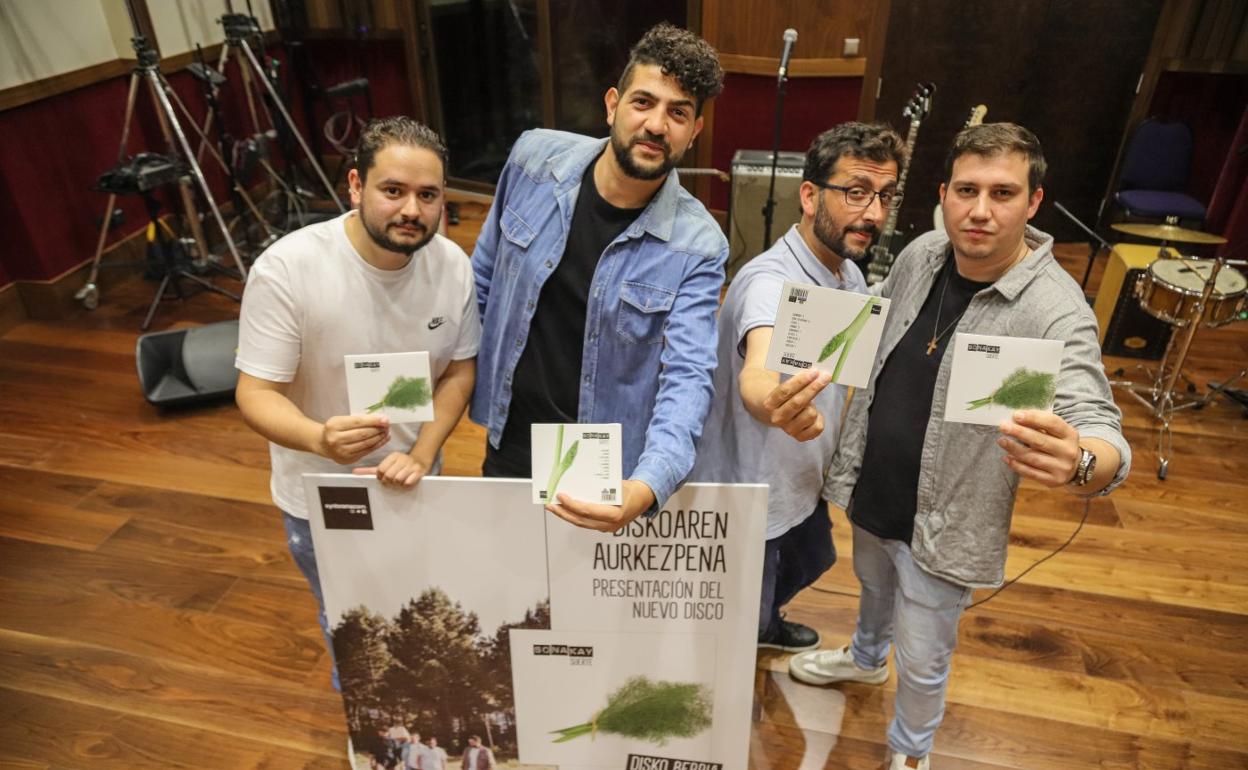 En un polígono industrial de Oiartzun, tras una puerta metálica se encuentra uno de los templos guipuzcoanos de la creación musical, Mecca Recording Studio. Sobre sus tapices Yoni Camacho (voz), David Escudero (guitarra), Ramón Vélez (guitarra), José Luis 'Beltza' Jiménez (bajo) y David Bernárdez (percursión), empiezan a dar palmas. Allí estuvieron durante el mes de marzo confeccionando las nueve pistas de este trabajo que este miércoles presentaron con un recital en directo. Relajados y con 'cachondeo' ofrecieron el tema homónimo del disco, con un punto de rumba y otro de ironía. Luego sonó 'Hutsa nirea', una balada flamenca de melodía desgarrada y un solo de guitarra eléctrica al más puro estilo Santana.