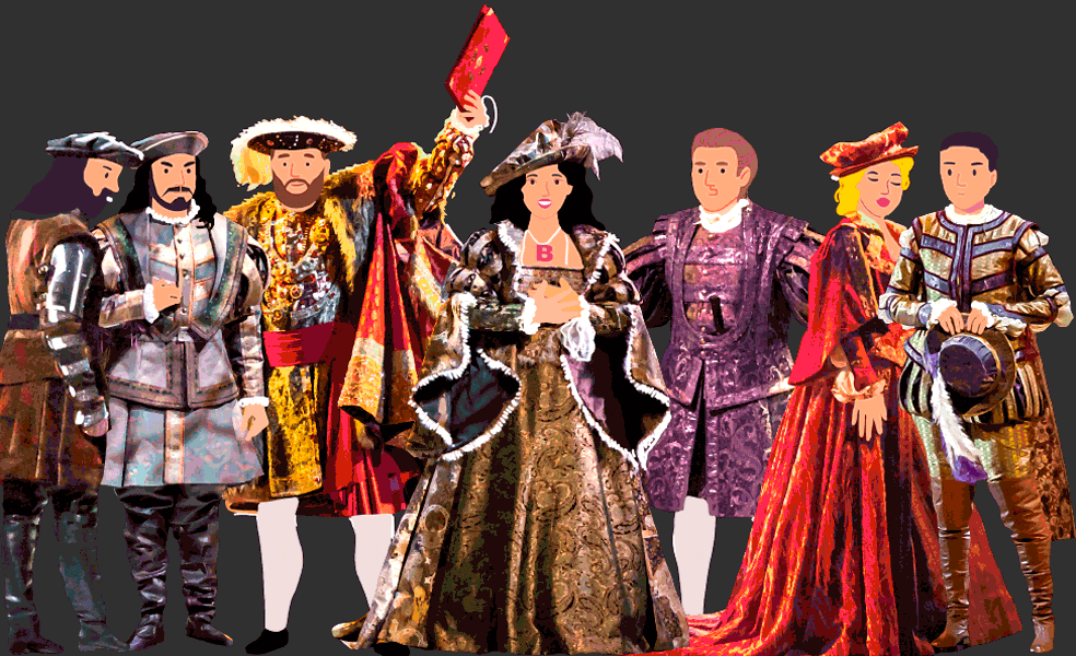 La indumentaria es un fiel reflejo de las prendas que supuestamente se llevaban en la corte de Enrique VIII. El terciopelo y los brocados; la seda de las medias masculinas, los tocados sofisticados... se enmarcan en el estilo Tudor más fastuoso.