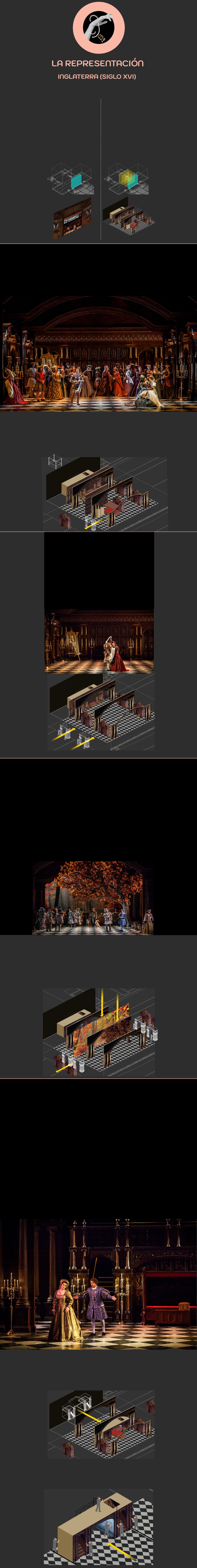 (pared ornamentada del fondo). Esta pared de madera se sube y baja en función de la escena.