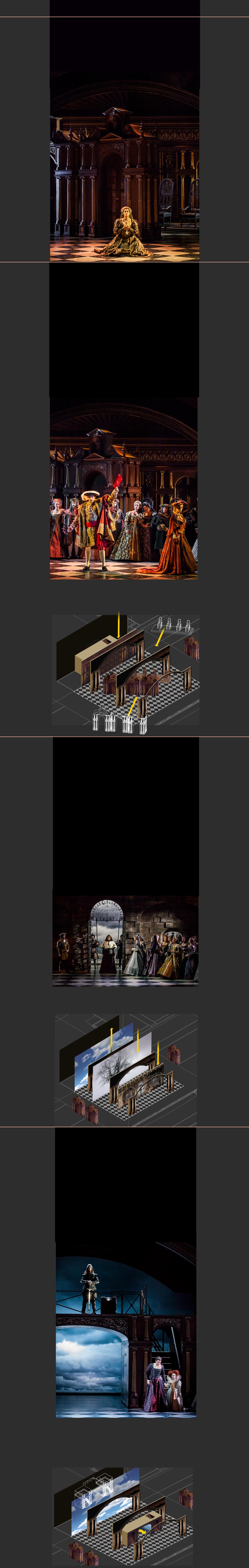 El balcón motorizado del acto I se ha convertido durante la pausa de la representación en la Torre de Londres. Una labor que lleva a los operarios unos 20 minutos. Es una estructura sólida, que soporta el peso de la gente. Se alzan el muro sol y el ciclorama del cielo nublado y se baja el del otro cielo.