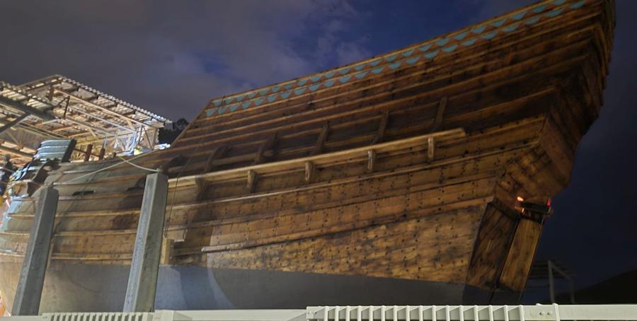 La popa de la embarcación es visible antes de que se proceda a su botadura este viernes a partir de las 17.00 en un evento que podrá seguirse por todo el entorno de la bahía de Pasaia