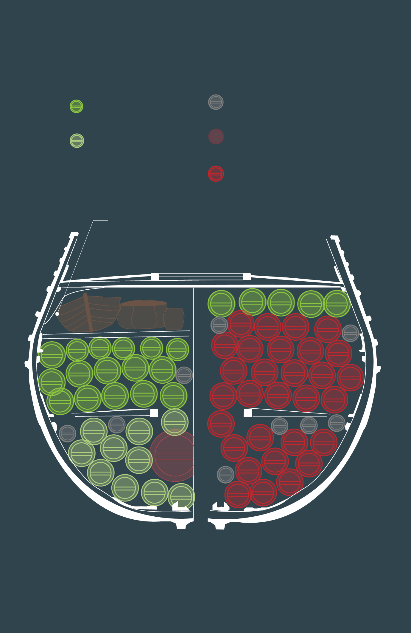 Para un viaje tan largo no solo se necesitaban hombres. «Una travesía como la del San Juan podía durar dos meses hasta Terranova. Luego pasaban unos seis meses allí, cazando y procesando ballenas hasta llenar el barco», explica Agote. Además de los barriles que volverían llenos de aceite, la nao cargaba provisiones para meses: barriles repletos de habas, guisantes secos, tocino y galletas de barco —durísimas, hechas solo con harina, agua y sal, horneadas dos veces para eliminar toda humedad— y sidra. No llevaban agua porque se corrompía durante la travesía y provocaba enfermedades. Las bebidas alcohólicas, en cambio, se conservaban perfectamente. La sidra también aportaba vitamina C frente a una dieta limitada. Cuando estaba disponible, además, la tripulación comía pescado y carne de ballena.