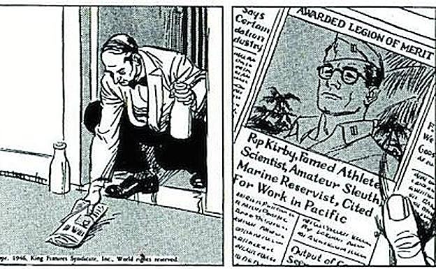 Rip Kirby no es tal, al menos según qué enfoque se dé al debate, pero lo que no puede discutirse es que su personalidad queda definida por Raymond a la perfección desde el primer momento. Y no tarda mucho en hacerlo, al menos en cuanto a sus capacidades y logros se refiere. Exactamente ocurre en la segunda viñeta de la famosísima primera tira de Rip, reproducida bajo estás líneas. En el titular del periódico puede leerse: «Condecorado con la Medalla al Valor, deportista famoso, científico, detective aficionado, reservista de los marines, mencionado por su valor en el Pacífico». Además de eso, el lector pronto irá descubriendo que el detective viste siempre de forma impecable, fuma en pipa, posee una educación exquisita y una sangre fría a la altura de su determinación, apoyada en un intelecto superior. Su situación económica es más que desahogada, tal y como acredita que, en su apartamento de Manhattan, vive con su mayordomo Desmond y, curioso entonces para un héroe de acción entrando en el terreno de la anécdota, lleva gafas. Sus investigaciones le llevarán a bajos fondos muy reales, donde luchará contra delitos también muy reales llevados a cabo por delincuentes muy reales, como su némesis Mangler, alejados de los caricaturizados por Dick Tracy. Su novia, Honey Dorian y otras mujeres que se sienten atraídas por un hombre que encarna lo perfecto, como la amante del mencionado villano, Pagan Lee… Es decir, un universo compacto, dentro de una tira en blanco y negro. El mejor blanco y negro de todos los tiempos.