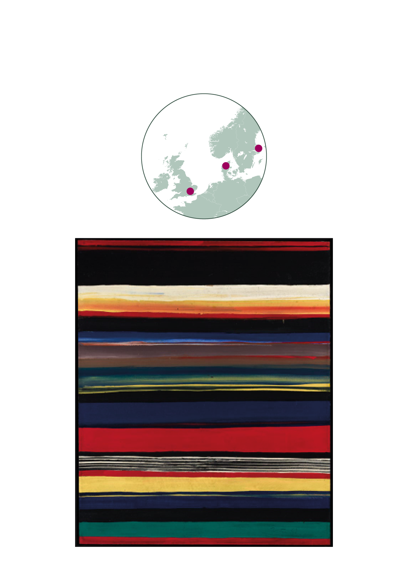En 1962 emprendió una nueva etapa en Estocolmo y Londres, y viajó a Dinamarca. La luz fría del norte y la energía industrial británica ordenaron su pintura, hasta entonces más impulsiva, en franjas horizontales de colores puros, antes de derivar hacia formas orgánicas. Una técnica que pronto derivaría en ondulaciones y formas orgánicas. En Suecia, el clima y su situación personal ralentizaron su producción, pero las experiencias ampliaron su disciplina.