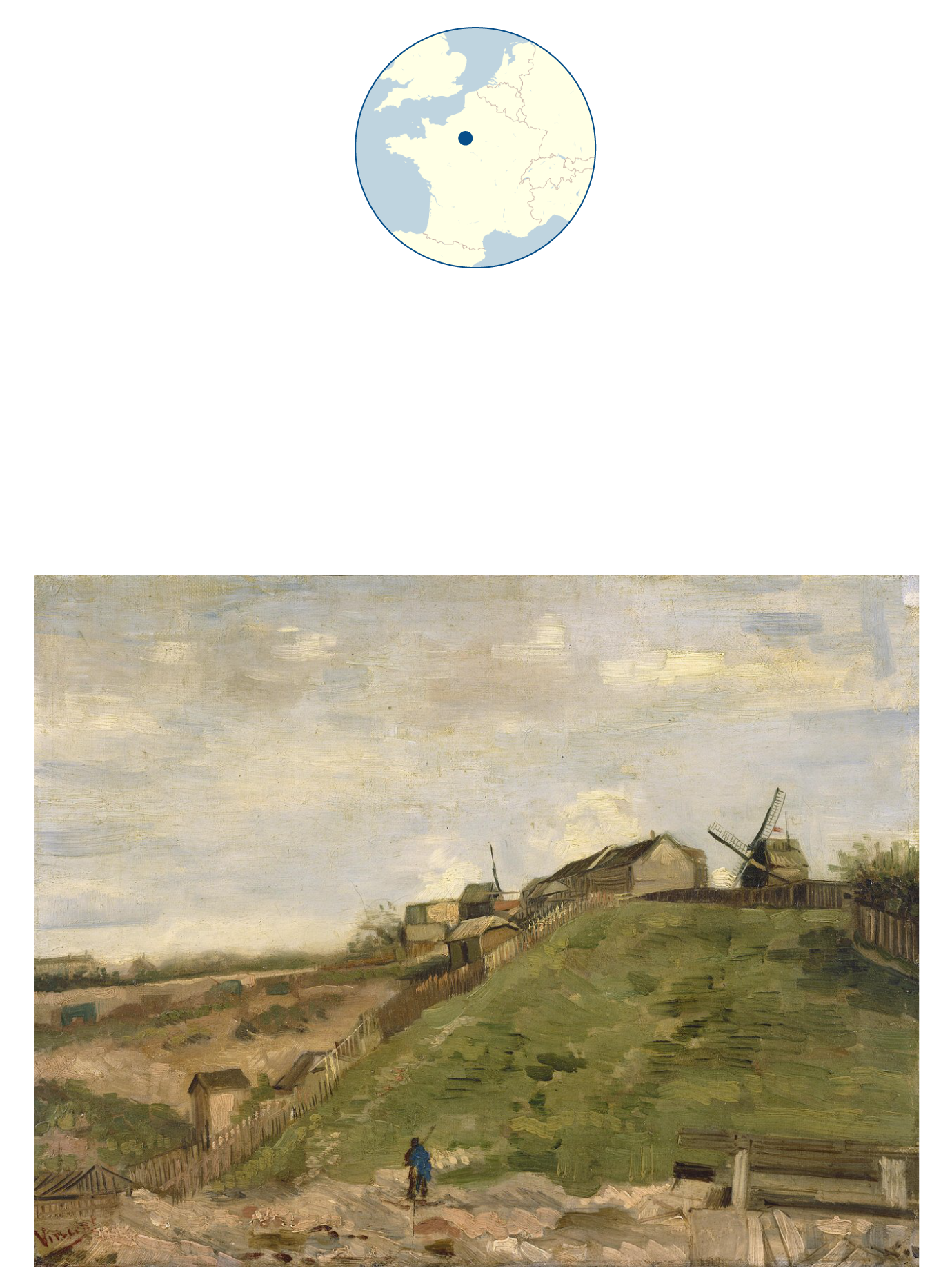 En esta pintura, las pinceladas dinámicas y levemente arremolinadas y los colores anuncian el movimiento posimpresionista que Van Gogh abrazaría a lo largo de su carrera. Este movimiento artístico surgió de la preocupación de algunos artistas, entre ellos Paul Cézane y Georges Seurat, acerca de la expresión naturalista de la luz y el color. Ese año el artista acababa de llegar a París y se instaló en Montmartre con su hermano, un barrio ubicado en el distrito dieciocho de París, en la ribera derecha del Sena. La colina que corona ese barrio con praderas todavía vírgenes, un molino, algunas vacas dispersas constituyen la escena rural de la pintura.