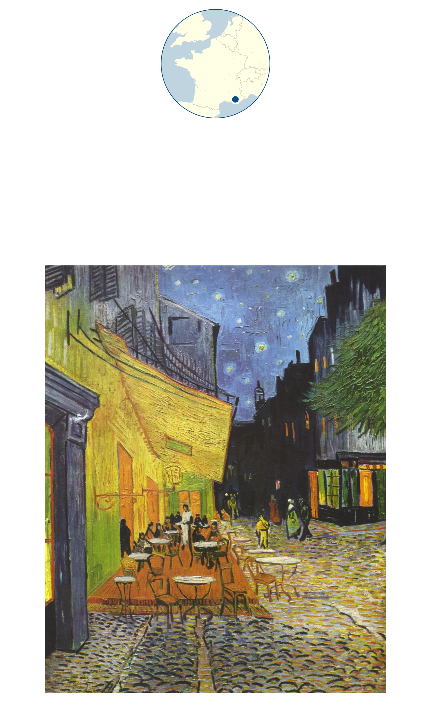 En los quince meses que pasó Van Gogh en Arlés, donde se mudó persiguiendo la luz de la Provenza, pintó trescientos cuadros. Enamorado del ukiyo-e, una técnica de estampas japonesas en madera que representaba escenas de la vida cotidiana, llegó al sur de Francia a pintar todo lo que veía. Este es uno de sus cuadros más célebres, en el que plasma, según sus propias palabras: «Un café por la noche visto desde fuera. En la terraza están sentadas pequeñas figuras bebiendo. Un enorme farol amarillo ilumina la terraza (...) e incluso extiende su resplandor hasta la calle adoquinada que adquiere una tonalidad rosa-violeta.» Es un cuadro de noche, pero el artista no utilizó pintura negra. Fiel a su estilo, se aferró a la distorsión expresiva y se centró en el contraste del azul frío de la noche y la luz cálida de la lámpara. Es una pintura llena de texturas dominada en su parte superior por una familiar noche estrellada. El establecimiento, rebautizado como «Café Van Gogh», aún existe en la ciudad, pero actualmente permanece cerrado.