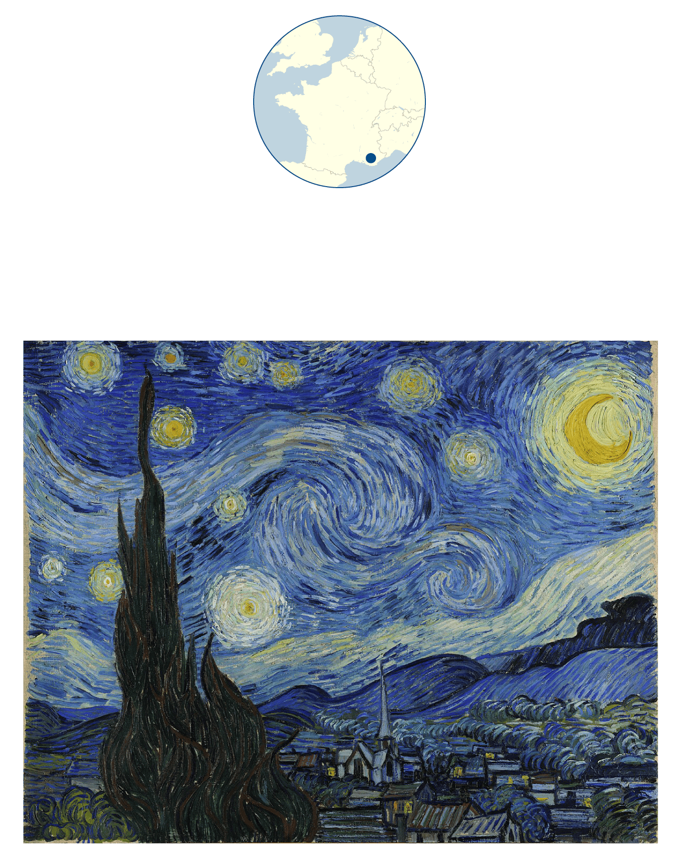 En 1889, Van Gogh se internó voluntariamente en el hospital psiquiátrico de Saint-Rémy-de-Provence. Desde la ventana, observaba cipreses, estrellas y un profundo cielo nocturno. Aunque lo acosaban las alucinaciones, pintó 150 obras. Una de ellas se convirtió en su pintura más célebre: capturó en el lienzo un cielo azul, espiralado e hipnotizante, junto a estrellas y una luna con un gran halo amarillo. Debajo, una ciudad quieta y tranquila, pero atravesada por el sentimiento de un artista que sintió intensamente.
