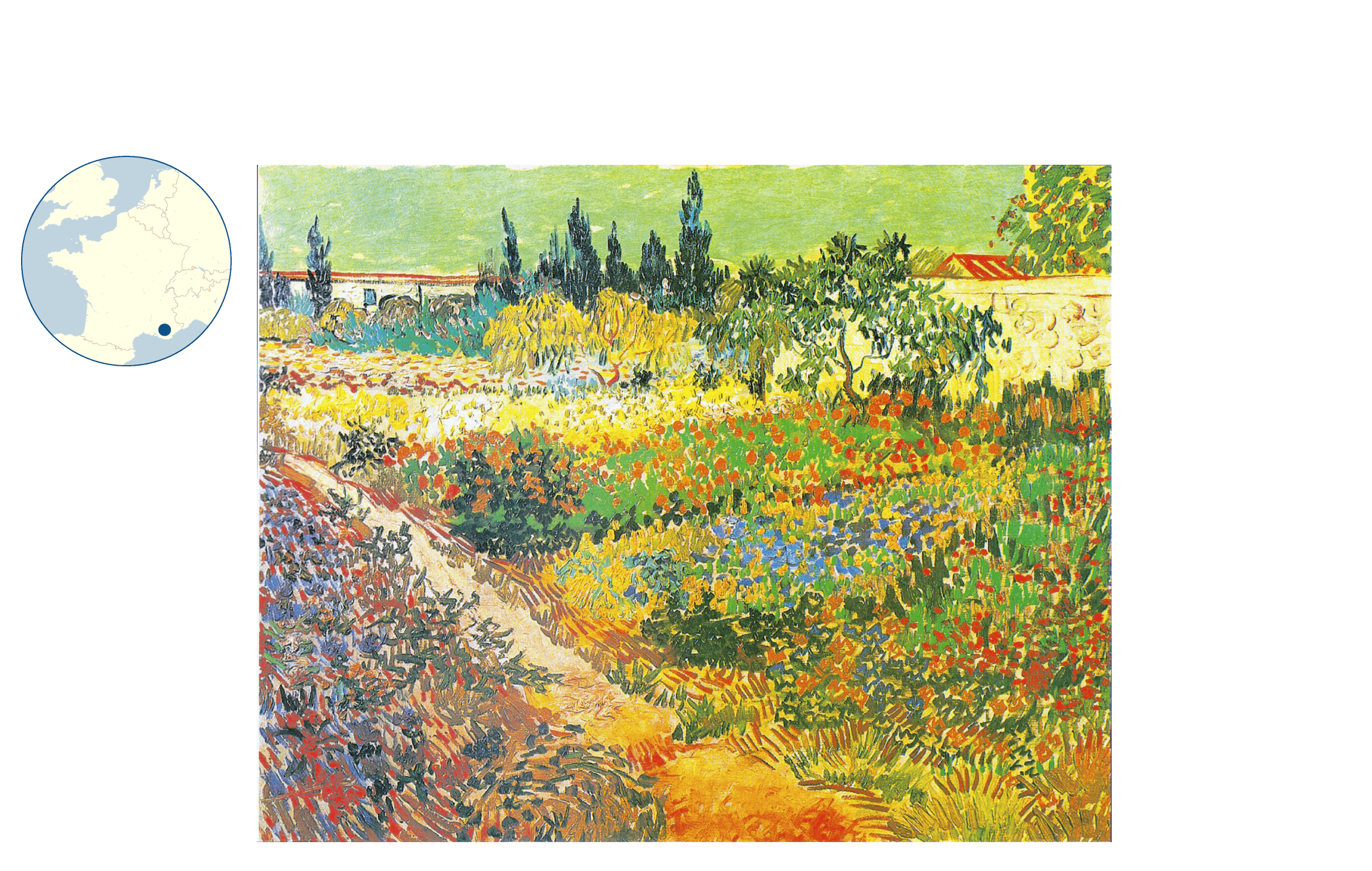 En un sur acariciado por el sol, Van Gogh retrató la primavera. La paleta de la obra vibra con una combinación de colores primarios y secundarios —muchos de ellos invisibles para la percepción humana—, acompañada de pinceladas expresivas y densas. Este jardín desbordado de flores, que fue el patio del hospital psiquiátrico donde estuvo ingresado y que hoy se conoce como Espacio Cultural Van Gogh, marca el despertar de la voz colorística del artista.