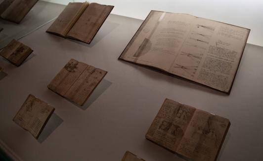 Tiene su complemento gratuito en la muestra que ofrece la Biblioteca Nacional de España (BNE). Ahí brillan las joyas de la corona, los códices 'Madrid I' y Madrid II', dos de los 23 manuscritos autógrafos que existen en todo el mundo surgidos de la zurda de Leonardo. Son dos volúmenes en una pieza extraordinaria y de valor incalculable. Redactados en tono a 1500 con la escritura especular de Leonardo, proceden de la biblioteca de Felipe V y están desde 1712 en poder de la corona española. El códice I es un tratado de mecánica y estática y el II, un estudio de fortificación, estática y geometría.