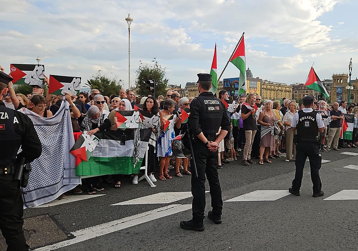 Con gritos de 'Palestina askatu', 'Israel boicot', 'no es una guerra es un genocidio' o 'Israel hiltzaile, Europa laguntzaile', los manifestantes han protagonizado una sonora protesta. En las inmediaciones se ha desplegado un amplio dispositivo policial y de momento no se han registrado incidentes.
