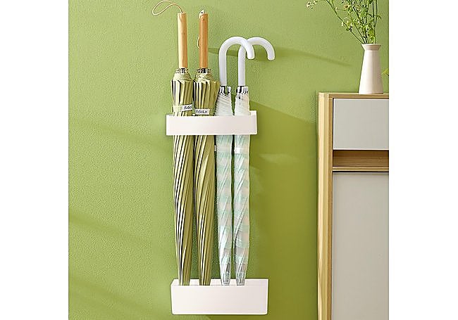Instalación sin agujeros. El paragüero de pared SYXLS tiene un diseño compacto y está fabricado en ABS. Incluye una bandeja de goteo desmontable para facilitar la limpieza y el almacenamiento del agua. Permite organizar hasta cuatro paraguas en espacios reducidos y se instala sin necesidad de perforar las paredes.