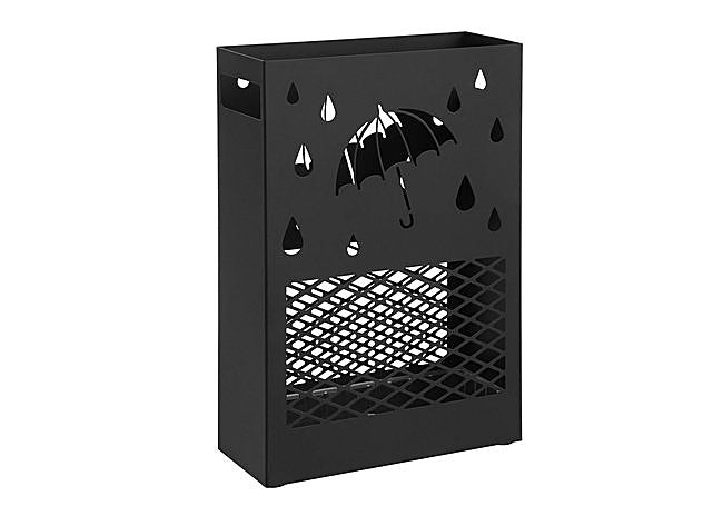 Con estructura metálica y formato rectangular, este paragüero SONGMICS destaca por su diseño tallado y elegante acabado en negro. Incorpora bandeja extraíble para recoger el agua y cuatro ganchos que facilitan la organización de paraguas o bastones. Sus dimensiones compactas y las almohadillas protectoras aseguran estabilidad y cuidado del suelo en la entrada o la oficina.
