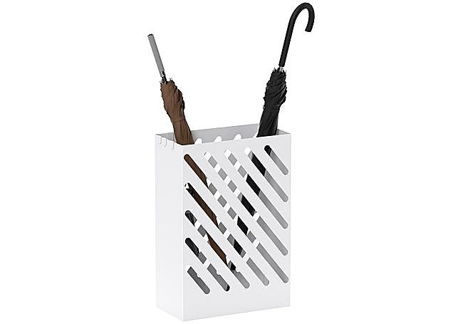 Con líneas sencillas y acabado blanco, el paragüero Versa Rulo combina estructura metálica resistente y formato compacto de 49 x 15,5 x 15,5 cm. Incorpora un plato interno para retener el agua y ofrece estabilidad sin necesidad de montaje. Su diseño es moderno y compacto, adecuado para espacios reducidos como entradas, salones u oficinas.