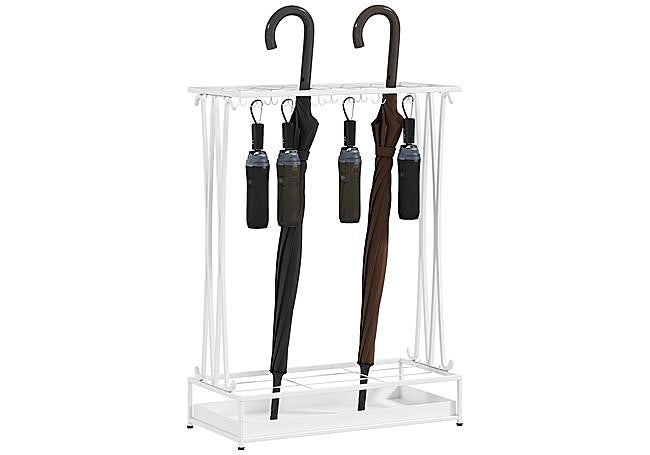 El paragüero rectangular HOMCOM está fabricado en acero pintado blanco y cuenta con 21 compartimentos y 24 ganchos para organizar paraguas de manera eficiente. Incluye una bandeja recogegotas extraíble para facilitar la limpieza y evitar charcos en el suelo, asegurando un ambiente ordenado y seco.