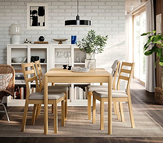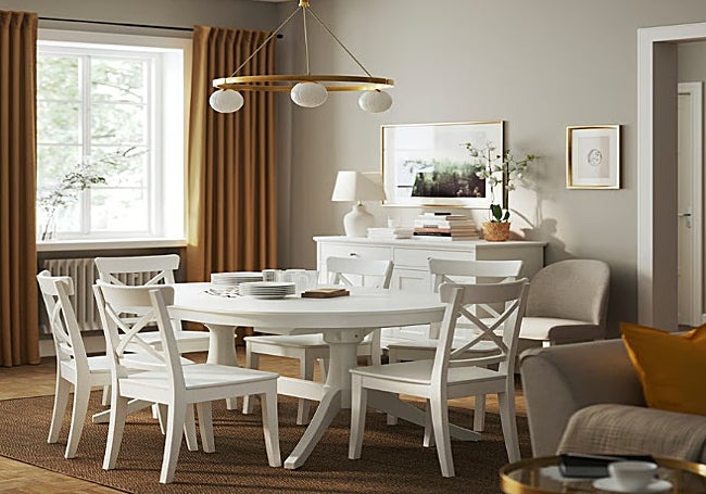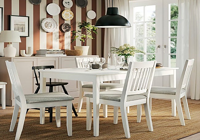 La más barata y con ese blanco de IKEA que tanto gusta. La mesa tiene un largo máximo de 190 cm y un ancho de 80 cm. Aunque viene con 4 sillas, podrás sentar a la mesa hasta 6 personas sin problemas. Su precio es de 375€.