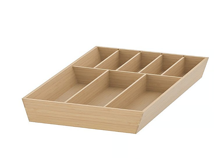Y como los cubiertos también importan, acomódalos en esta bandeja fabricada en bambú claro que tiene unas medidas de 32 x 50 cm. Cuenta con patas de plástico para que no baile dentro del cajón. Son 12,99€.