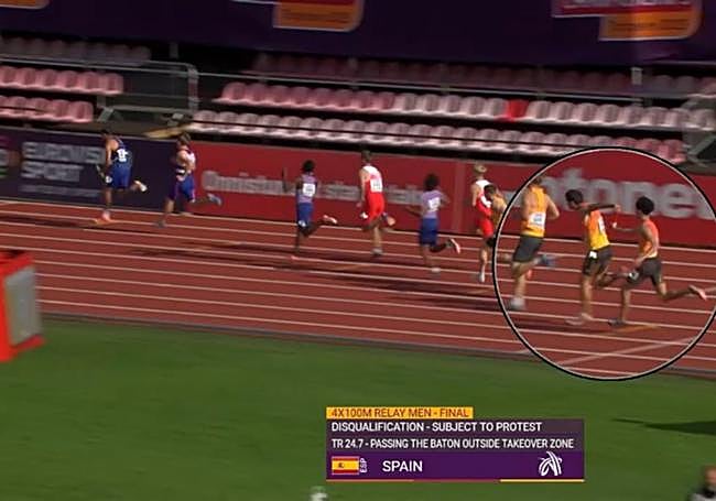 La resolución definitiva de los jueces tardó en llegar, pero acabaron confirmándose las malas noticias para el cuarteto español, que en semifinales logró el segundo mejor tiempo tras Gran Bretaña, que no consiguió llegar a meta con el testigo en la final. En las imágenes, en la repetición centrada en ese entrega entre Hernández y Garaiar, se veía claramente que entregaban fuera de zona. No habia lugar a la duda.
