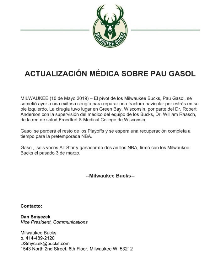 Fue operado el jueves de una fractura por estrés en el pie izquierdo, estará al menos tres meses de baja y Milwaukee asegura que «se espera una recuperación completa para la pretemporada NBA», que comienza en septiembre