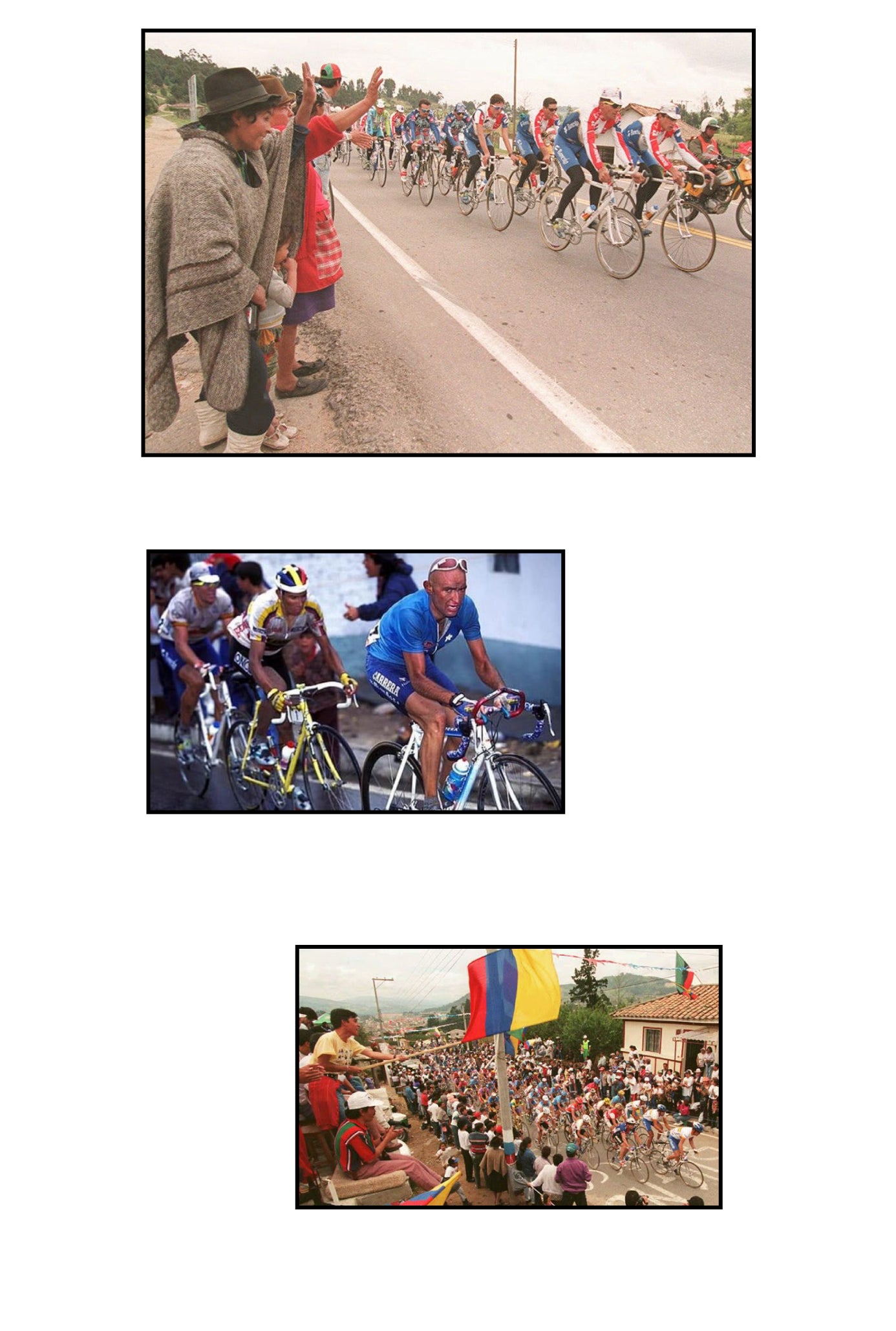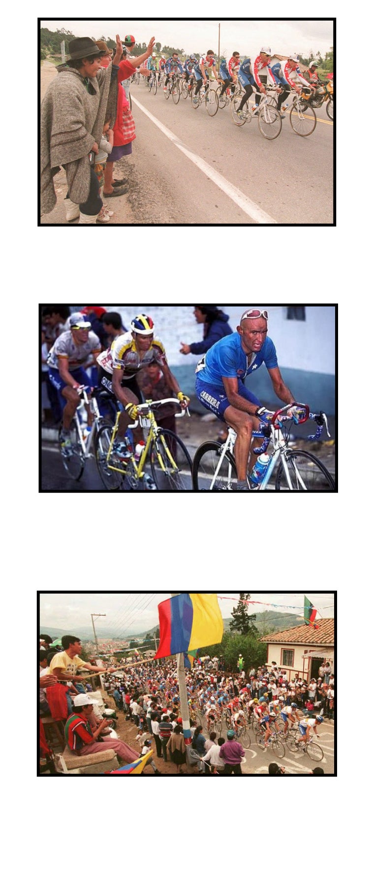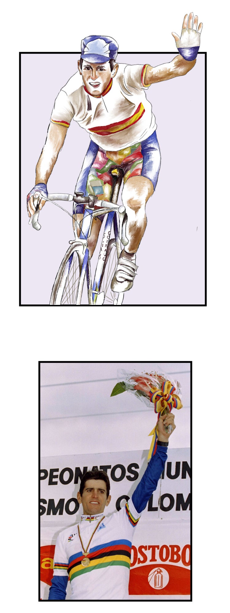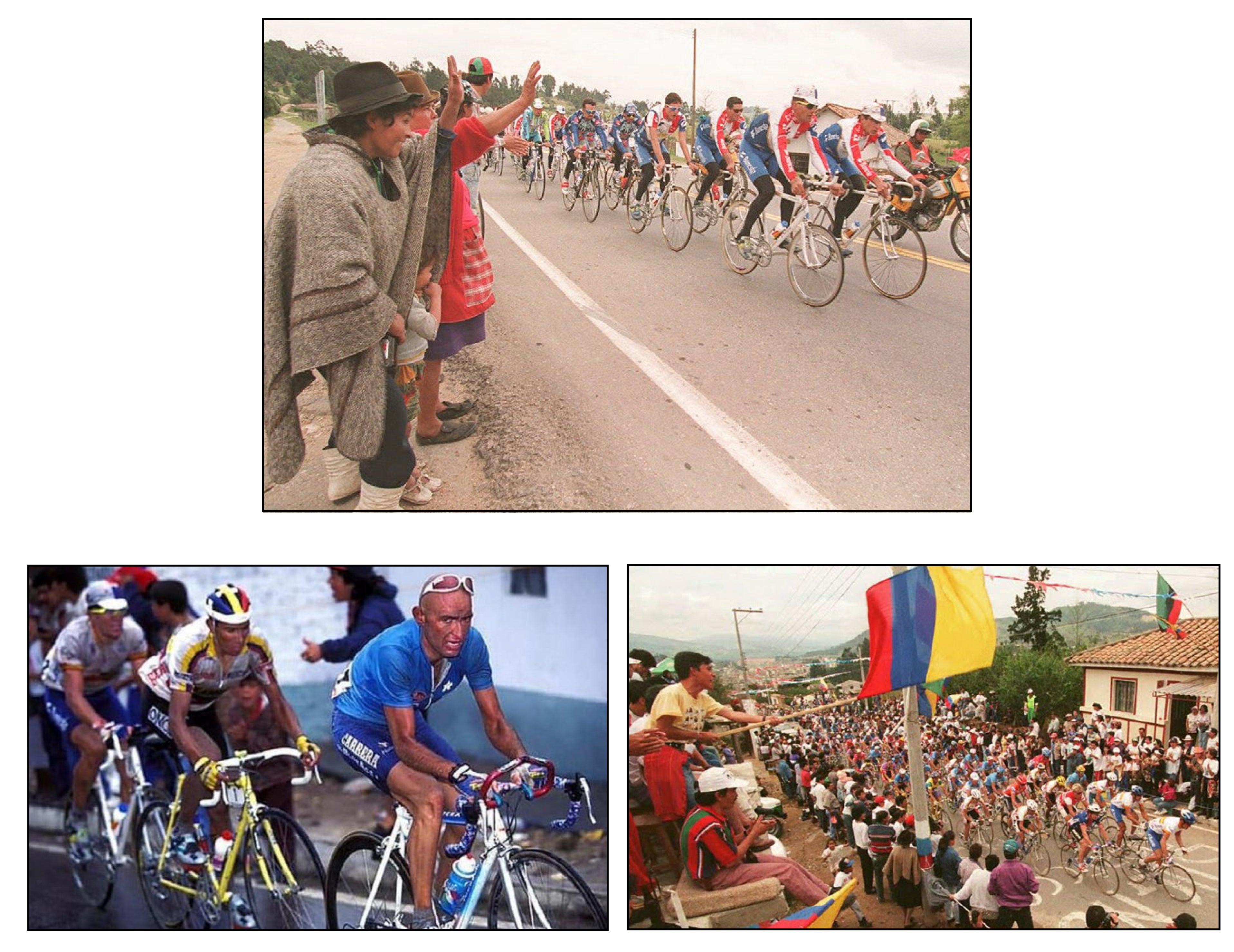 Sobre estas líneas un entrenamiento con Indurain a la cabeza y Olano en tercera fila con el maillot de Mapei y gorra. Abajo a la derecha el público anima a los corredores al inicio de la prueba. Duitama se volcó con el mundial, ofreciendo casas particulares para alojar a equipos. A la izquierda, Pantani tira con Oliveiro Rincón y Miguel Indurain a su rueda en el alto de El Cogollo, la gran dificultad del campeonato del mundo de 1995.