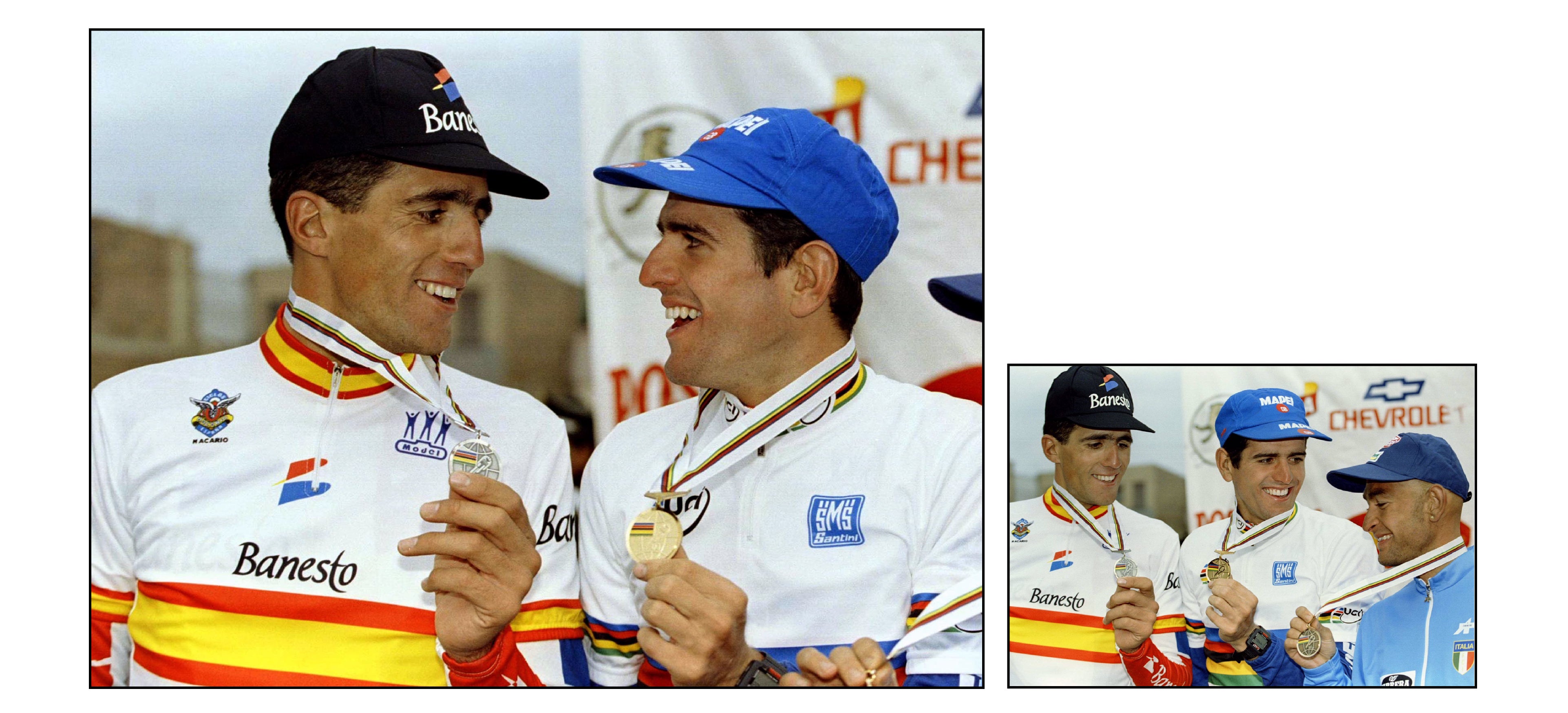 A la izquierda, Indurain y Olano se sonríen tras lograr el primer y segundo puesto. Abajo, enseñan sus medallas junto al Italiano Pantani.