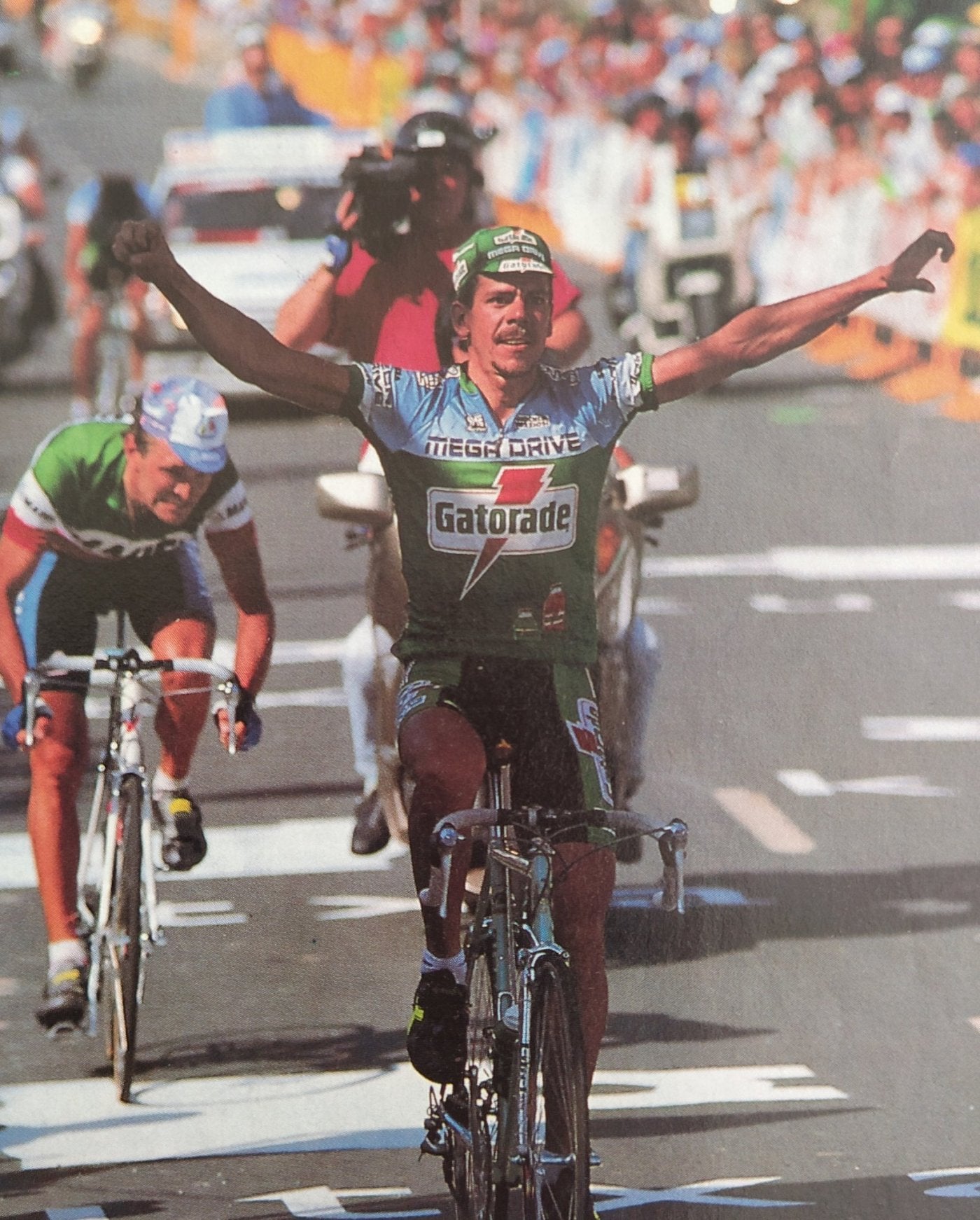 Por descarado y generoso al mismo tiempo ganó la etapa de aquel Tour. Tiró de Etxabe sin rechistar y con fuerza hasta que el vizcaíno recobró el aliento para relevarle. «No soporto esa actitud de reclamar con el codo. ¡Coño, haz hueco, haz la distancia, y ya tendrás tiempo de ver si el que va atrás se escaquea o no puede, o de hacer la lectura que sea». El modo de correr, y ganar, le importaba. «Me gustaba hacar saltar la chispa. De hecho, me llamaban muchos criteriums en Francia. Los abanicos, por ejemplo. Cuando surgían, allá que iba. Me emociona todavía esa foto del abanico en la que que salgo con Kelly y Fignon, los tres con el pelo para un lado».