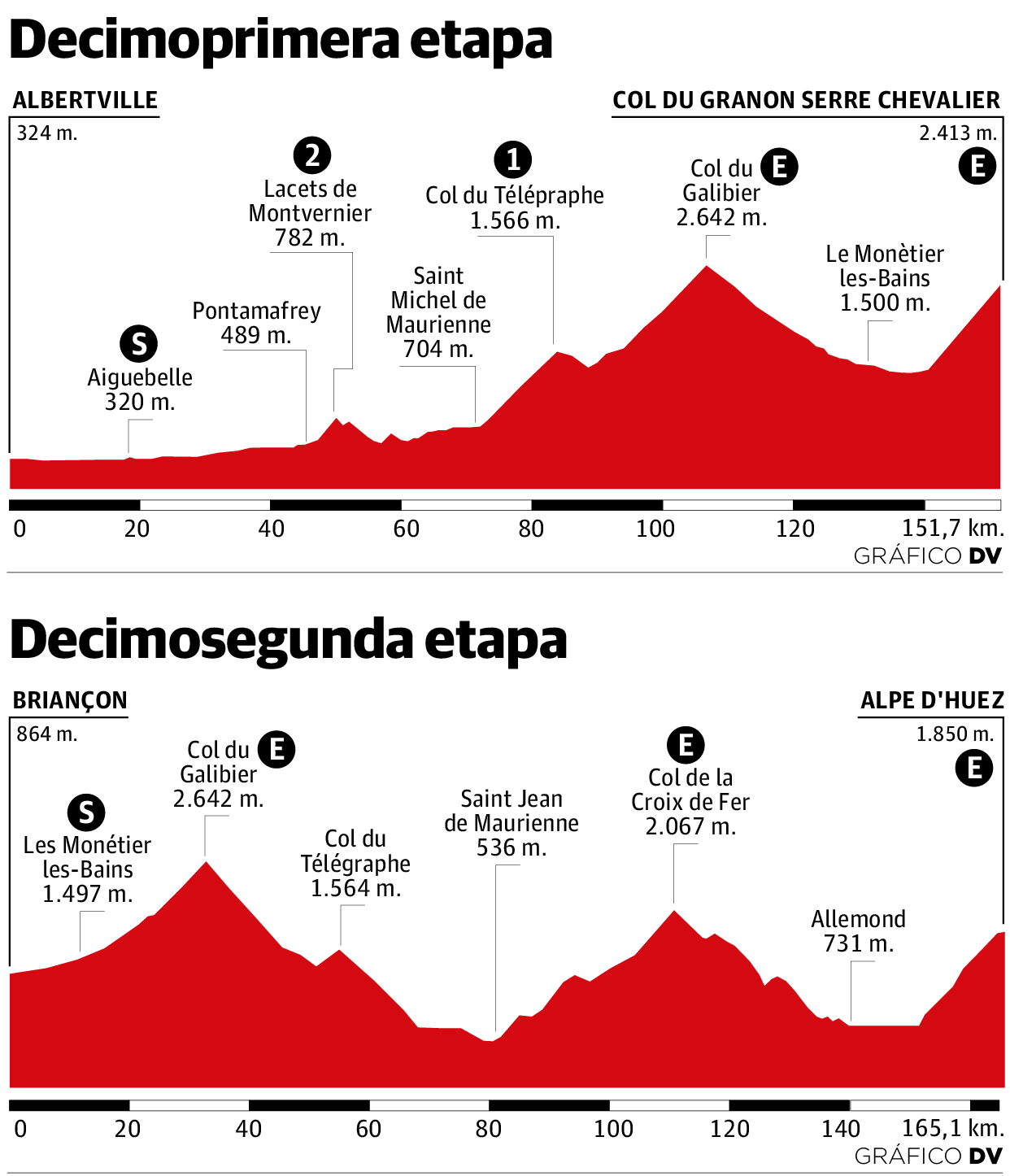 El Tour llega a los Alpes y entra por la puerta grande. Por el Galibier, un gigante que causa pánico por su enormidad y el ... peso de la historia que le contempla. Este miércoles se subirá por su lado más duro, la vertiente norte, la que viene del Télégraphe y que, sin apenas descanso entre los dos colosos, encadena más de 35 kilómetros de subida para alcanzar los 2.642 metros de altitud. Una vez superado el gran coloso, la etapa se encaminará al Granon. El jueves se vuelve a subir el Galibier, por el otro lado, para seguir por la Croix de Fer y acabar en Alpe d'Huez.