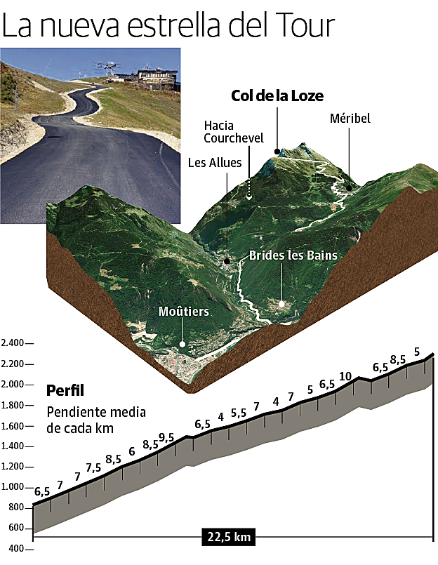 ¿El techo del Tour? Será el Col de la Loze, a 2.304 metros. «El prototipo de puerto del siglo XXI», anunció Christian Prudhomme, enamorado de esta carretera, en realidad una pista de 7 kilómetros dedicada únicamente a las bicicletas, por encima de la estación de esquí de Meribel. «Es una sucesión de rupturas de pendiente, todas brutales», explicó el director del Tour, entusiasmado tras la prueba realizada el verano pasado en el Tour del Porvenir, la prueba referencia para los menores de 23 años. «El resultado fue definitivo», declaró el organizador de esta carrera de referencia, Philippe Colliou.