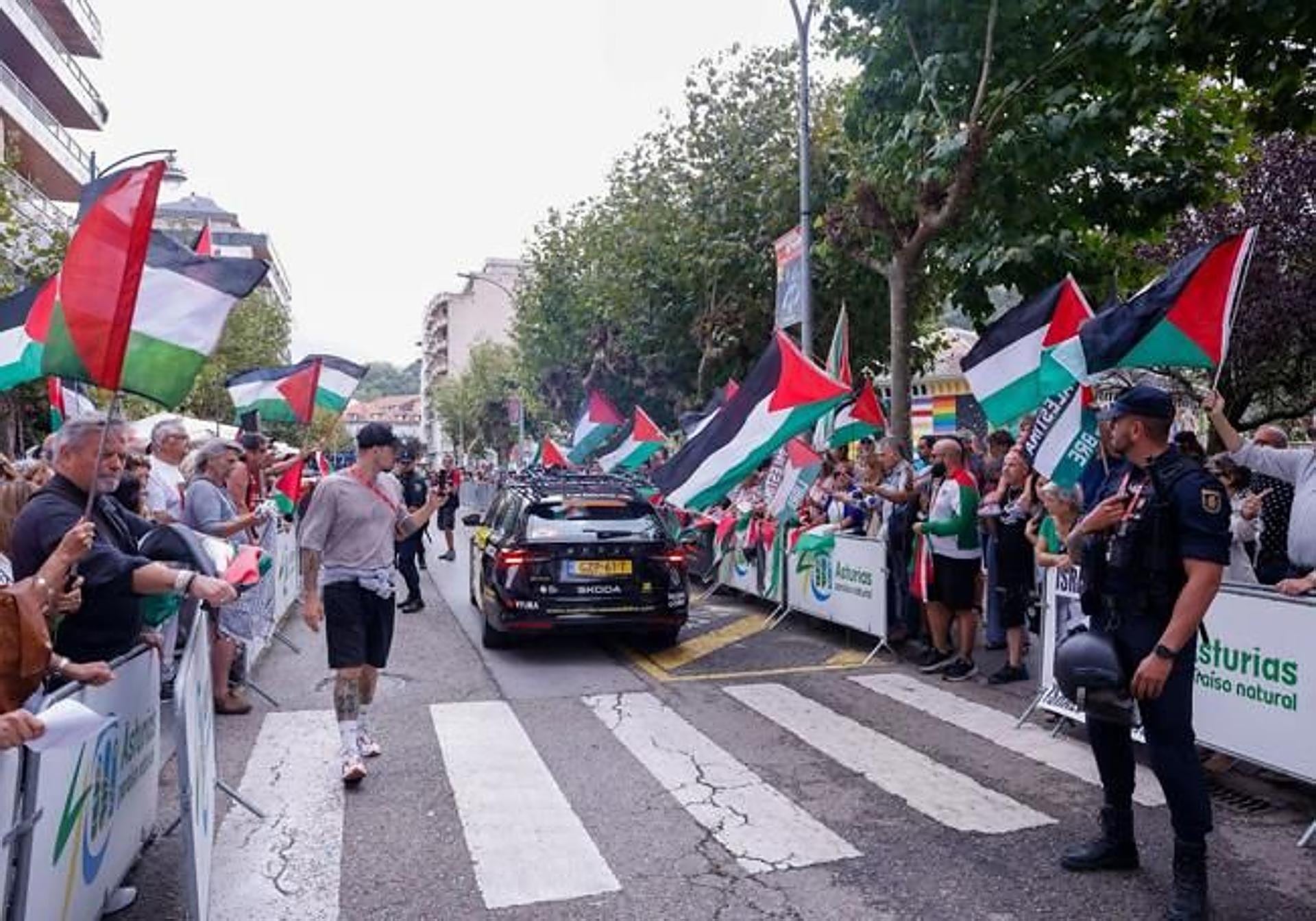El periplo de la Vuelta por Asturias se preveía convulso. El Gobierno de la región, presidido por el socialista Adrián Barbón, anunció que ningún representante institucional acudiría a los actos oficiales programados por la organización de la competición. También pidió al Israel Premier Tech que abandonase: «No podemos permanecer impasibles ante la masacre en Gaza».