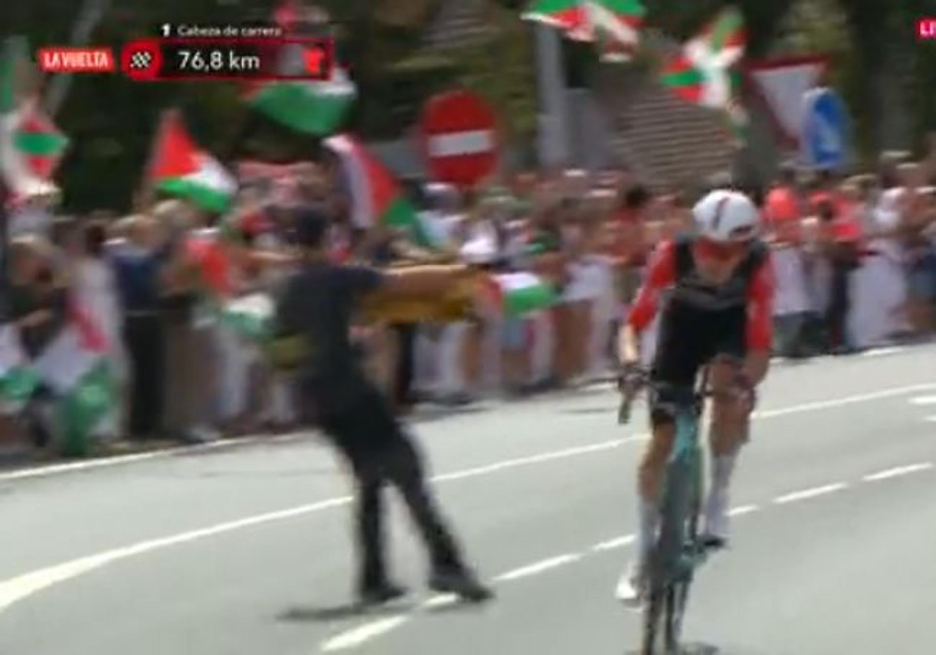 Javier Romo se va al suelo después de que un espectador haya irrumpido en el asfalto. #VueltaRTVE7S #LaVuelta25