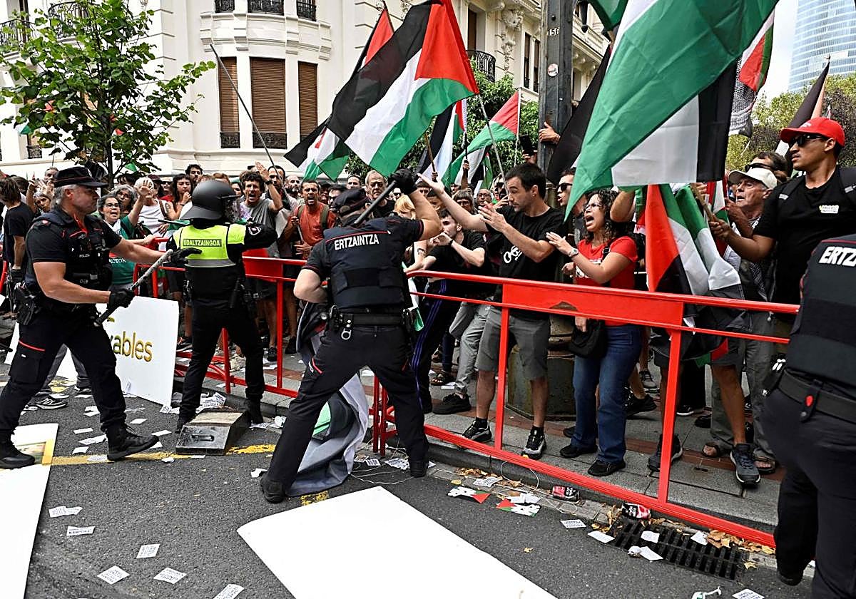 El final de la decimoprimera etapa de la Vuelta a España en Bilbao ha tenido que ser recortada en tres kilómetros tras los incidentes contra Israel y a favor de Palestina que se han registrado en la Gran Vía de Bilbao. Manifestantes han empujado las vallas publicitarias y han tratado de acceder al recorrido en el primer paso por meta del pelotón a cuarenta kilómetros del final. En un primera momento, la organización ha intentado bloquear la protesta y la Ertzaintza se ha visto obligada a actuar.