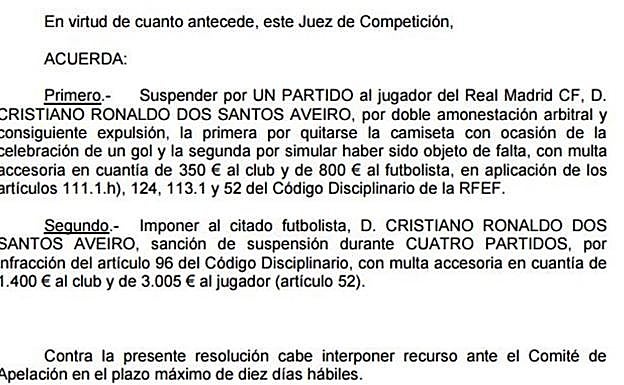 El juez de competición sanciona a Ronaldo por su gesto tras "en señal de disconformidad" y tras la doble amarilla. El Madrid tiene "diez días hábiles" para recurrir a Apelación.