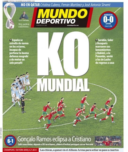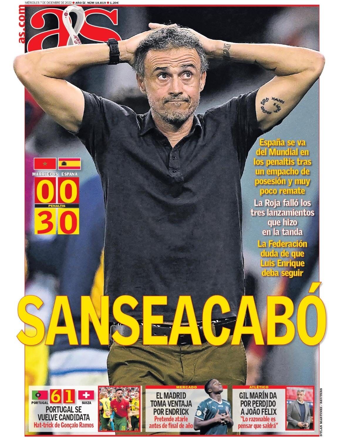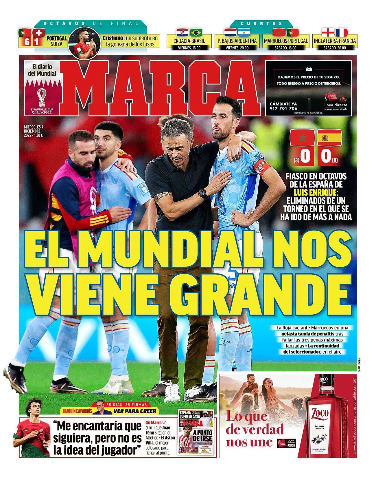 En los diarios deportivos, los palos se repiten. 'Marca', por ejemplo: «El Mundial nos viene grande. Fiasco en octavos de la España de Luis Enrique: eliminados de un torneo en el que ha ido de menos a más». Por su parte, 'As' dice. «Sanseacabó. España se va del Mundial en los penaltis tras un empacho de posesión y muy poco remate». Y añade que la Federación duda que Luis Enrique deba seguir. 'Mundo Deportivo' también se detiene en la incapacidad de La Roja para asustar a Marruecos. «KO Mundial. España se estrella de nuevo en los octavos, incapaz de perforar la buena defensa magrebí y de meter un solo penalti». Y 'Sport' hace una reflexión algo más general. «Vaya palo». 'Superdeporte' es más contundente: «Fracaso Mundial».