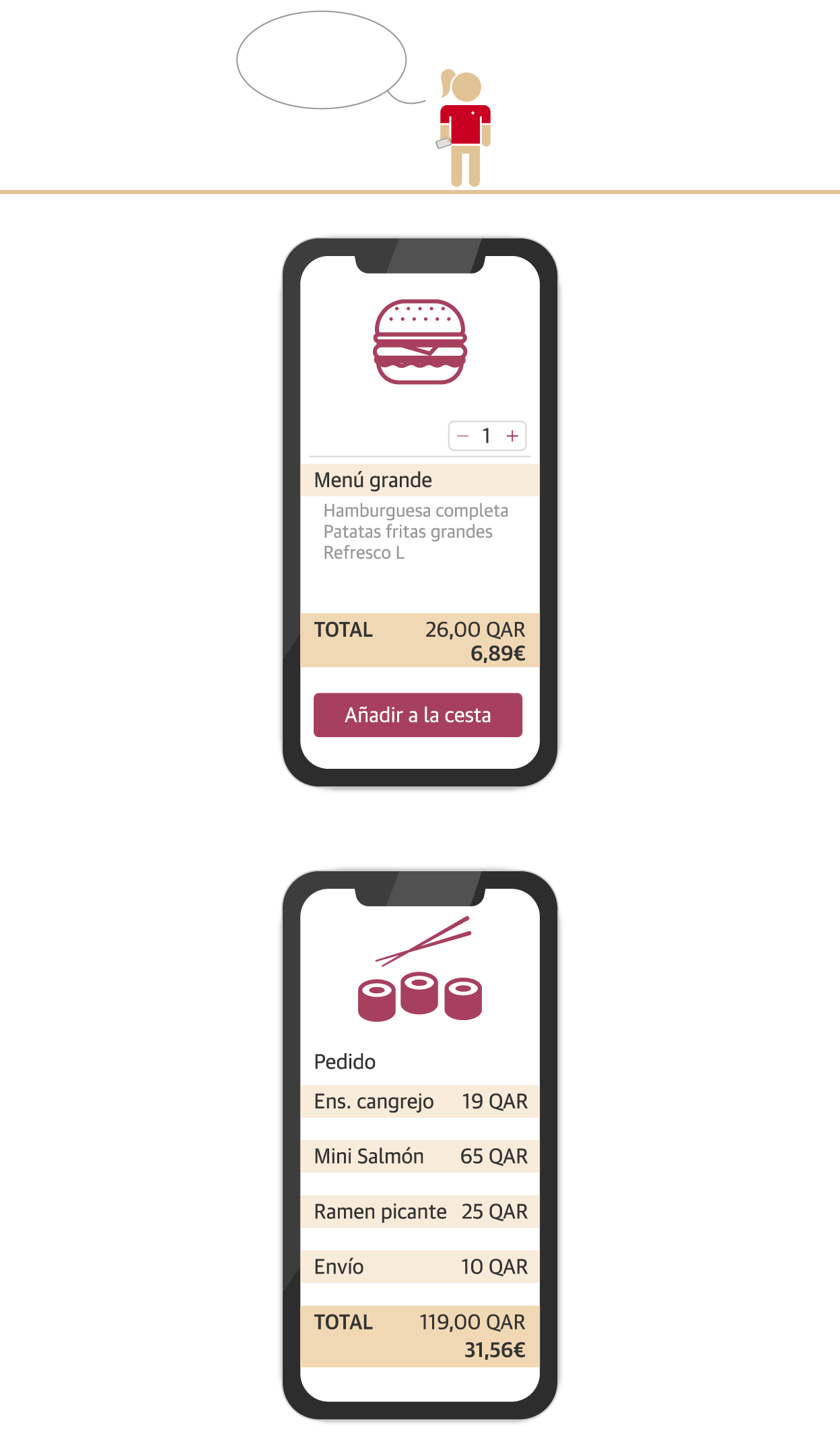 Ya que durante el partido no hemos comido ni bebido por miedo a los precios, salimos con hambre y ojeamos distintos restaurantes. En Qatar es más fácil encontrar restaurantes con comidas de todas partes del mundo que uno típico de allí. El precio es bastante similar al que nos podemos encontrar en el mismo tipo de establecimientos en España.