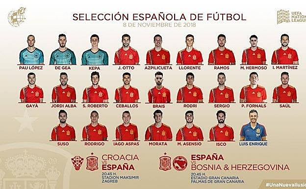 En total, Luis Enrique ha convocado a 24 futbolistas, uno más que en la última, y en la que ocho son novedades. Una situación que permite hablar de revolución, ya que supone un cambio en un tercio de la convocatoria, en la que hay jugadores de 14 equipos distintos, cinco jugadores de la Premier y uno de Italia. Con estos jugadores, España se medirá en Zagreb el 15 de noviembre a Croacia en el último encuentro de España en la fase de grupos de la Liga de las Naciones y que será decisivo para el futuro y tres días después se enfrentará en un amistoso a Bosnia-Herzegovina en Las Palmas de Gran Canaria, donde David Silva será homenajeado y hará el saque de honor.
