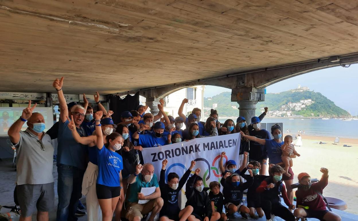 Medio centenar de aficionados, socios y deportistas del Club Atlético San Sebastián se han reunido esta mañana en su sede de la playa de La Concha para animar y celebrar la medalla de plata de Maialen Chourraut en los Juegos Olímpicos de Tokio.