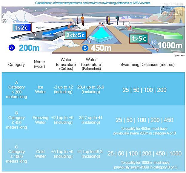 Uno se pone a temblar nada más repasar las categorías. En la categoría A, la más exigente, el agua está entre -2 y 2 grados centígrados y las distancias a nadar son 25, 50, 100 y 200 metros. En la categoría B, la temperatura del agua sube un poco y debe estar entre 2,1 y 5 grados. Aquí se puede nadar además la prueba de 450 metros pero para ello se debe demostrar que se es capaz de nadar 200 metros. Finalmente, en la categoría C se compite en aguas entre 5,1 y 9 grados y las pruebas se amplían hasta los 1.000 metros pero al igual que en el caso anterior, se debe haber realizado antes la prueba de 450 metros para poder inscribirse en los mil metros.