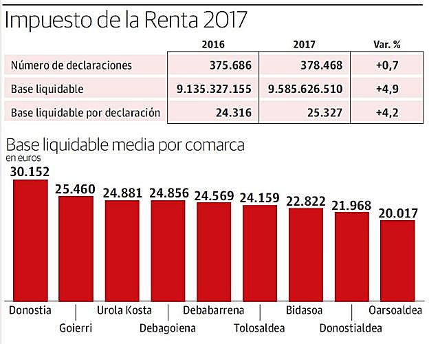 Solo en el último ejercicio cerrado (2017) la base liquidable entre los 378.468 declarantes guipuzcoanos repuntó un 4,9% (450 euros) y por primera vez en la serie histórica, los vecinos de Gipuzkoa disponían de unos recursos medios por encima de los 25.000 euros. En la clasificación comarcal de esa base liquidable destaca sobremanera Donostia, con 30.152 euros por declaración -es destacable también el mayor crecimiento de las rentas medias de los municipios turístico residenciales-. En el extremo opuesto, con una base de 20.017 euros, se sitúa la comarca de Oarsoaldea, consecuencia directa de que tres de los cuatro municipios que la componen (Pasaia, Errenteria y Lezo) se encuentran entre los seis que menor base liquidable media muestran.