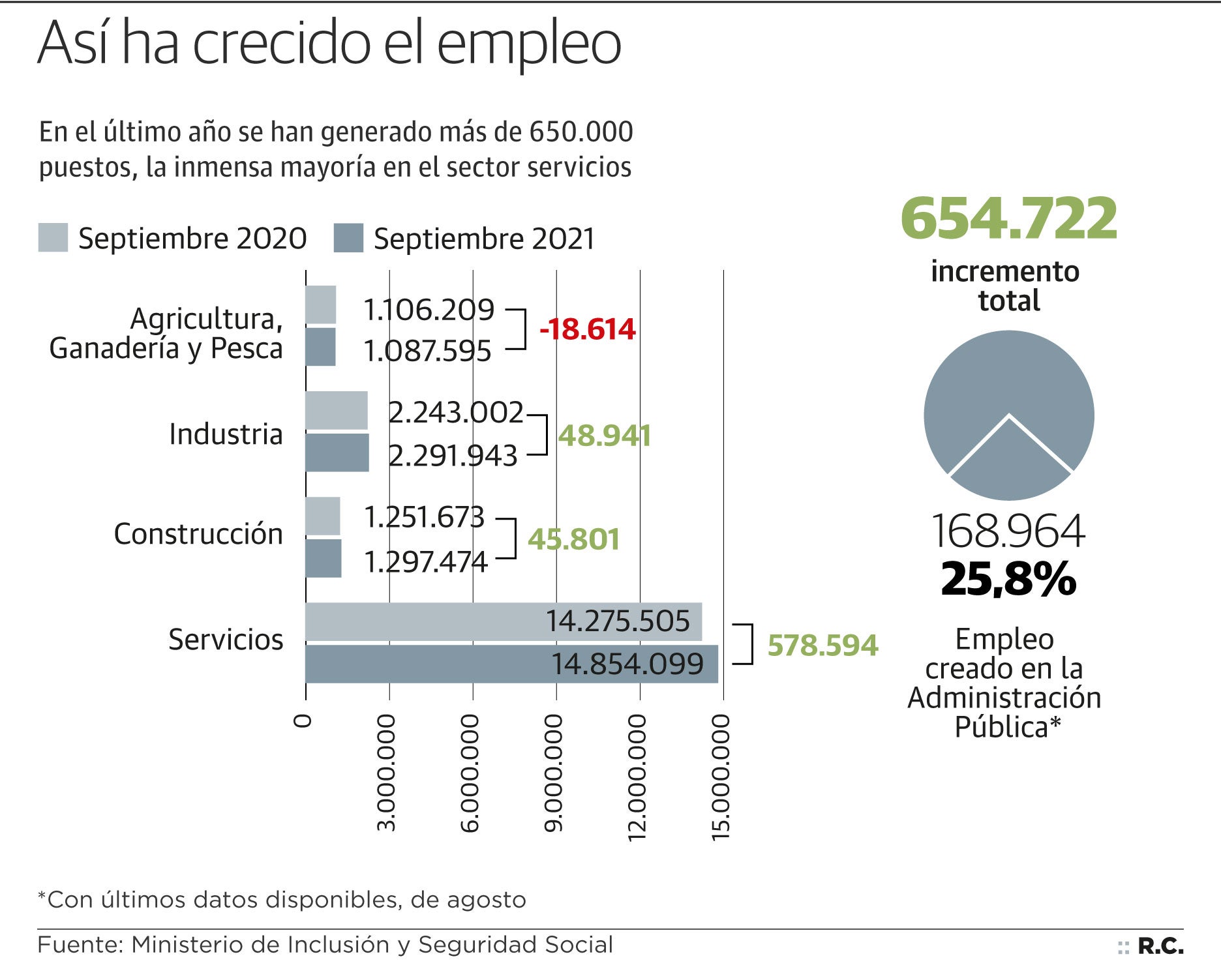 Además, también tuvieron que hacer acopio de personal los Servicios Públicos de Empleo (SEPE), debido a la avalacha de prestaciones por desempleo que tuvieron que tramitar, y la Seguridad Social, con la puesta en marcha de nuevas ayudas. Desde septiembre se han generado 67.600 puestos en actividades administrativas y servicios auxiliares y otros 42.100 en administración pública, defensa y seguridad social.