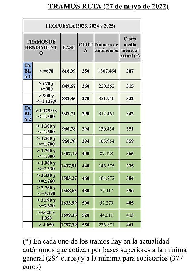 Según el borrador al que ha podido acceder este periódico que previsiblemente sufrirá modificaciones puesto que aún debe recibir el visto bueno de las principales organizaciones, las nuevas cuotas para los autónomos oscilarán entre los 250 y los 550 euros en función de trece tramos que se basan en los rendimientos netos (ingresos menos gastos deducibles).