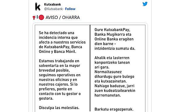 «Se ha detectado una incidencia interna que afecta a nuestros servicios de KutxabankPay, Banca online y banca móvil». Así explicaba Kutxabank en un comunicado los problemas que venían experimentando sus clientes esta mañana y que les ha impedido operar con sus móviles y ordenadores, así como realizar pagos con tarjeta en establecimientos comerciales hasta cerca de las tres de la tarde.