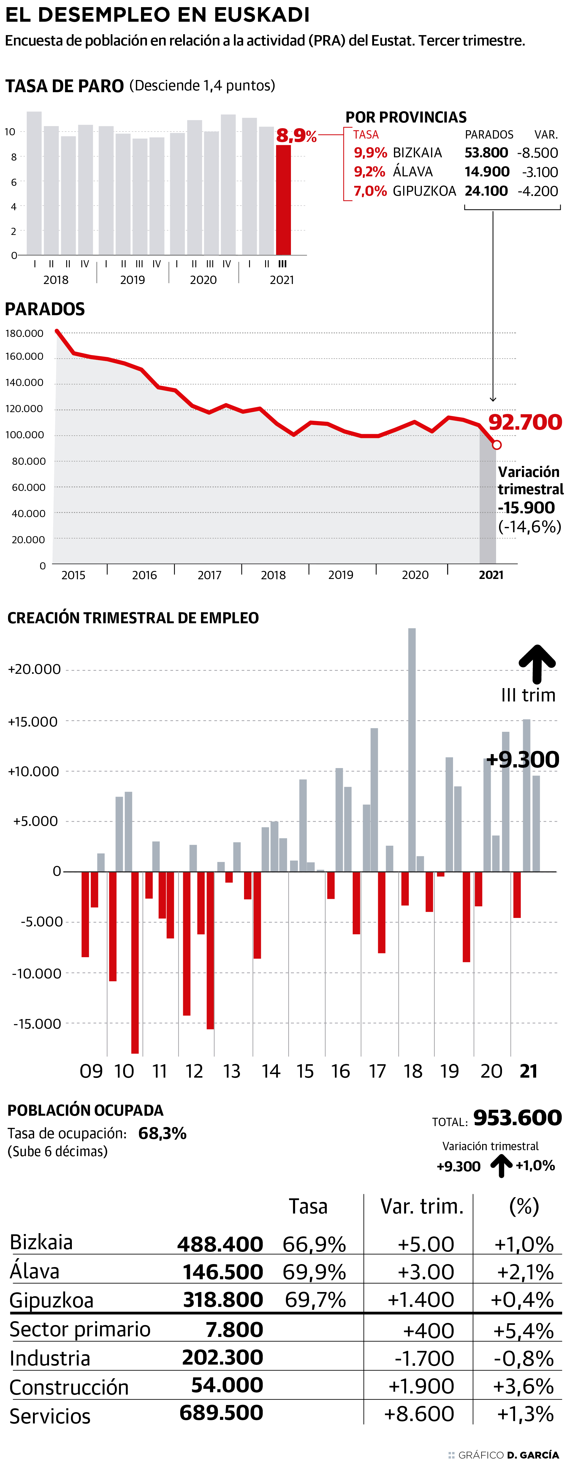 Sin sorpresas en este terreno, Gipuzkoa (con 24.100 desempleados en total) volvió a exhibir una tasa de paro mucho menor que la de los territorios vecinos. En este caso, del 7%, después de bajar 1,2 puntos y 4.200 desempleados. En Álava esa ratio es del 9,2%, tras descender en 3.100 personas, mientras en Bizkaia la tasa se sitúa en el 9,9%.