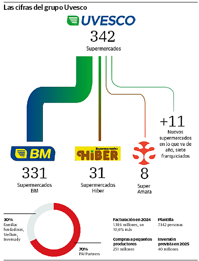 El anclaje definitivo a Euskadi y en especial a Gipuzkoa del Grupo Uvesco (BM y Súper Amara, con más de 7.100 empleados), que estuvo ... en claro riesgo de saltar por los aires el año pasado al ser pretendido por Carrefour, parece hoy más cerca. En la que sería la mayor operación de este tipo en la historia del País Vasco y una clarísima apuesta por el arraigo, parte del equipo directivo de la firma irundarra, con su CEO, Ángel Jareño, al frente, ha dado un valiente paso adelante para liderar la adquisición de la compañía, controlada hoy en un 70% por el fondo de inversión francés PAI Partners, que desde hace tiempo le ha puesto el cartel de 'Se Vende'. Una operación valorada en más de 700 millones de euros.